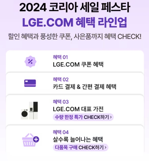 놓칠 수 없는 2024 코리아세일페스타 LG 가전 이벤트에서 그동안 눈여겨 왔던 제품 저렴하게 구입하시고, 다양혜택 모두 누리시기 바랍니다.