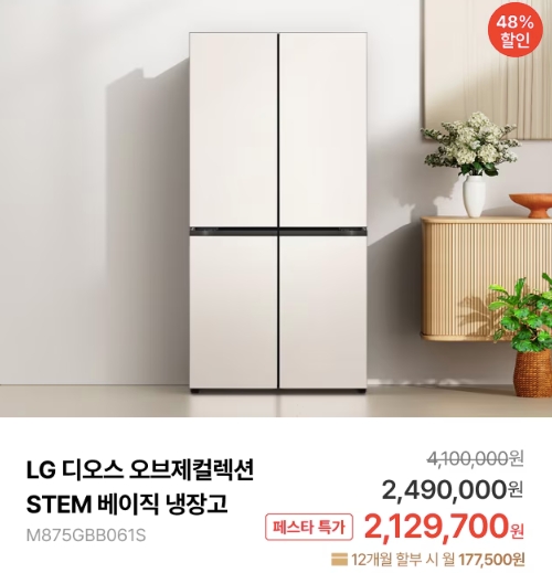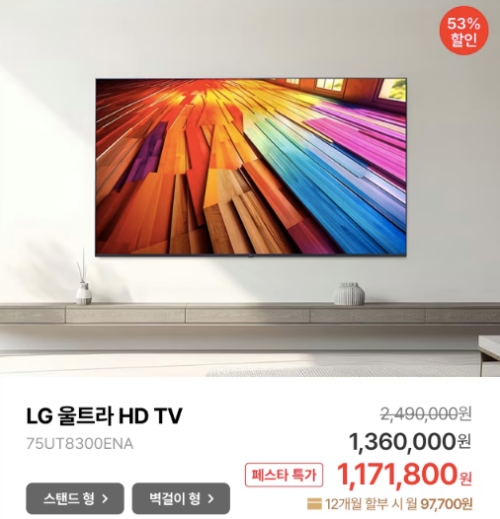티비와 냉장고는 이부 제품이 반값에 살 수 있는 기회가 열렸습니다. 평소 티비와 냉장고를 구매하려고 고민하셨던 분들은 지금 최대 할인 혜택을 누리세요. 모두 한정 수량이오니, 빠르게 선택하셔야 구매 가능합니다.