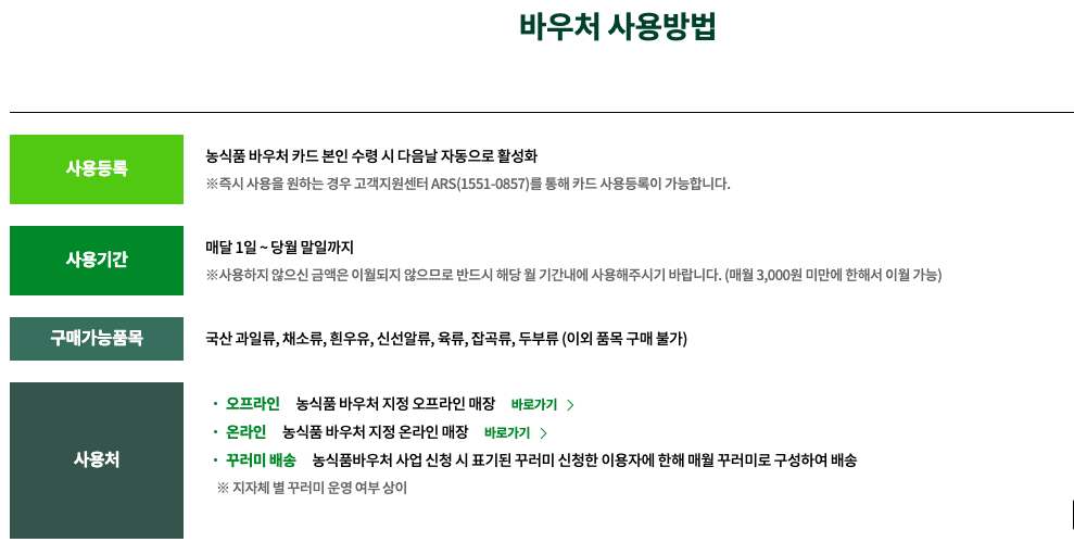 사용품목 : 국산 과일, 채소, 흰 우유, 신선 알류, 육류, 잡곡류, 두부류